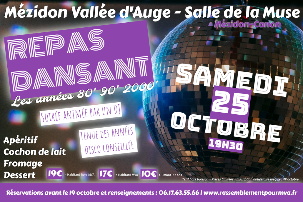 Une permanence pour les inscriptions au repas dansant se tiendra le vendredi 3 octobre, de 18h à 20h, à la Maison des Associations de Mézidon-Canon, à l'occasion de l'Assemblée Générale.