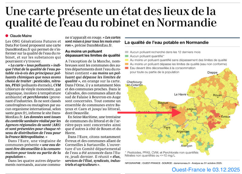 La pollution de l’eau potable est une préoccupation majeure pour beaucoup d’entre nous. Pourtant, il reste difficile de connaître précisément la qualité de l’eau que nous consommons. Bien que les données existent, elles sont souvent difficiles d’accès, complexes et peu compréhensibles. C’est pourquoi notre association, RMVA, soutient l’initiative de Générations Futures et Data For Good, qui ont créé "Dans Mon Eau". Cet outil innovant, simple et accessible à tous, centralise les données officielles sur la qualité de l’eau. Il est régulièrement mis à jour, chaque mois ou tous les deux mois, selon la disponibilité des résultats officiels (ARS).